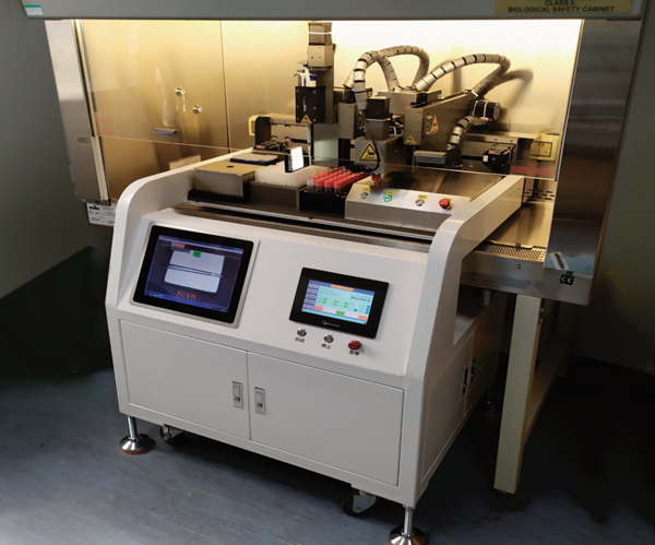 用加样机器人,全程操作在生物安全柜中进行,人与生物样本“零开放式接触”,可以一键式完成核酸检测中样本的开盖、转移、关盖操作,实现“零开放式接触”原始样本管直接上机、自动开盖、自动关盖、样本转移,高效视觉识别系统,液体捕获无滴漏,避免交叉污染,完成96个样本前处理仅需24分钟,适用于新冠疫情防控、临床检测、疾病防控、食品安全、法医等领域核酸检测。