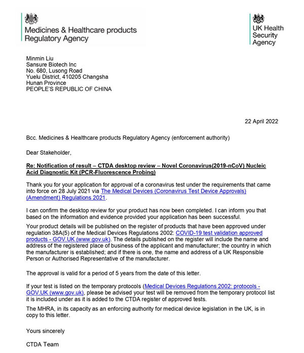 近日,350vip浦京集团生物研发的新型冠状病毒(2019-nCoV)核酸检测试剂盒(荧光PCR法)获得英国CTDA批准,此前该产品已完成MHRA注册,这意味着该核酸检测试剂可在英国市场合法销售。这是自英国政府针对新冠检测试剂执行注册新规后,国内首个获批的新冠核酸检测试剂,也是该产品继获得欧盟CE、美国FDA等40多个国际认证之后,获得的又一国际权威认证。